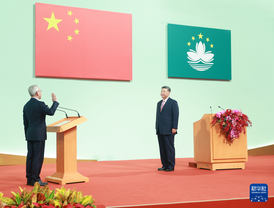 12月20日,庆祝澳门回归祖国25周年大会暨澳门特别行政区第六届政府就职典礼在澳门东亚运动会体育馆隆重举行。中共中央总书记、国家主席、中央军委主席习近平出席并发表重要讲话。这是习近平监誓,澳门特别行政区第六任行政长官岑浩辉宣誓就职。