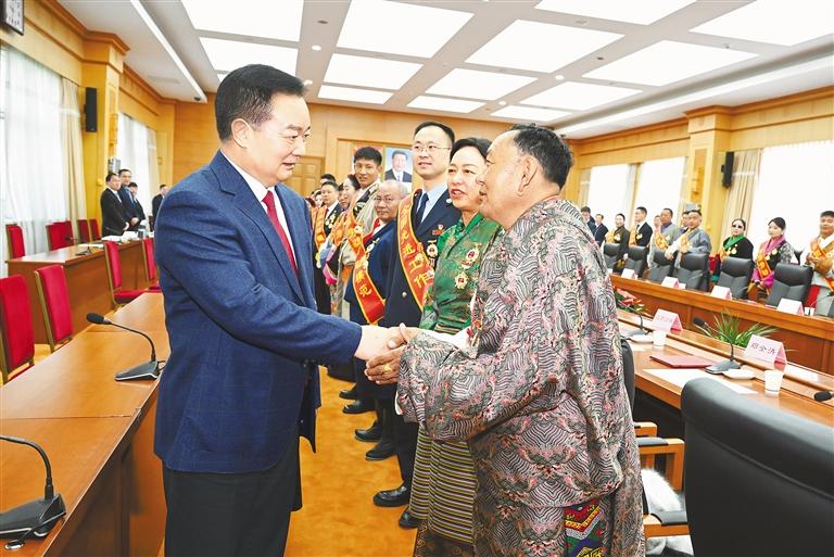 4月30日,自治区党委书记王君正在拉萨与我区受表彰的2025年全国劳动模范和先进工作者座谈。这是王君正同我区受表彰的2025年全国劳动模范和先进工作者亲切握手,表示热烈祝贺。本报记者 李洲 摄