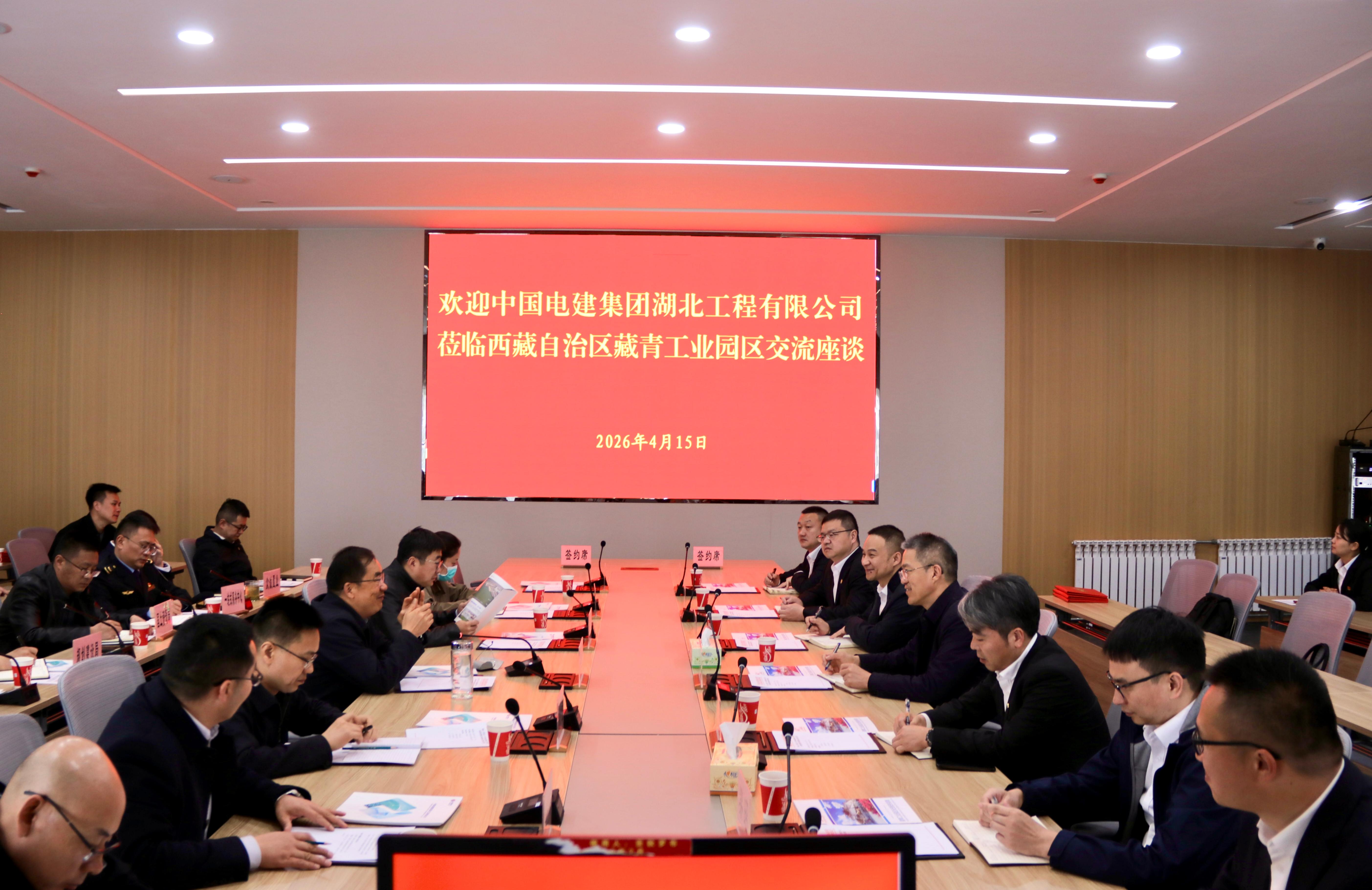 4月15日上午,中国电建集团湖北工程有限公司一行莅临藏青工业园区考察并开展交流座谈。格办(管委会)党组副书记、主任张国宏,格办(管委会)党组成员、副主任张晓阳,中国电建集团湖北工程有限公司党委书记、董事长张涛,副总经理董亚军等参加座谈。